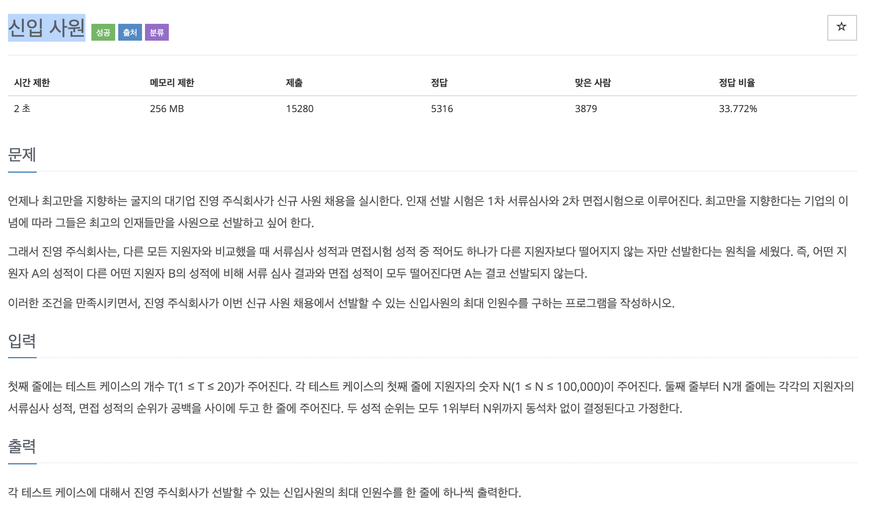 [백준알고리즘] 1946번: 신입 사원 -Python https://www.acmicpc.net/problem/1946 1946번: 신입 사원 첫째 줄에는 테스트 케이스의 개수 T(1 ≤ T ≤ 20)가 주어진다. 각 테스트 케이스의 첫째 줄에 지원자의..