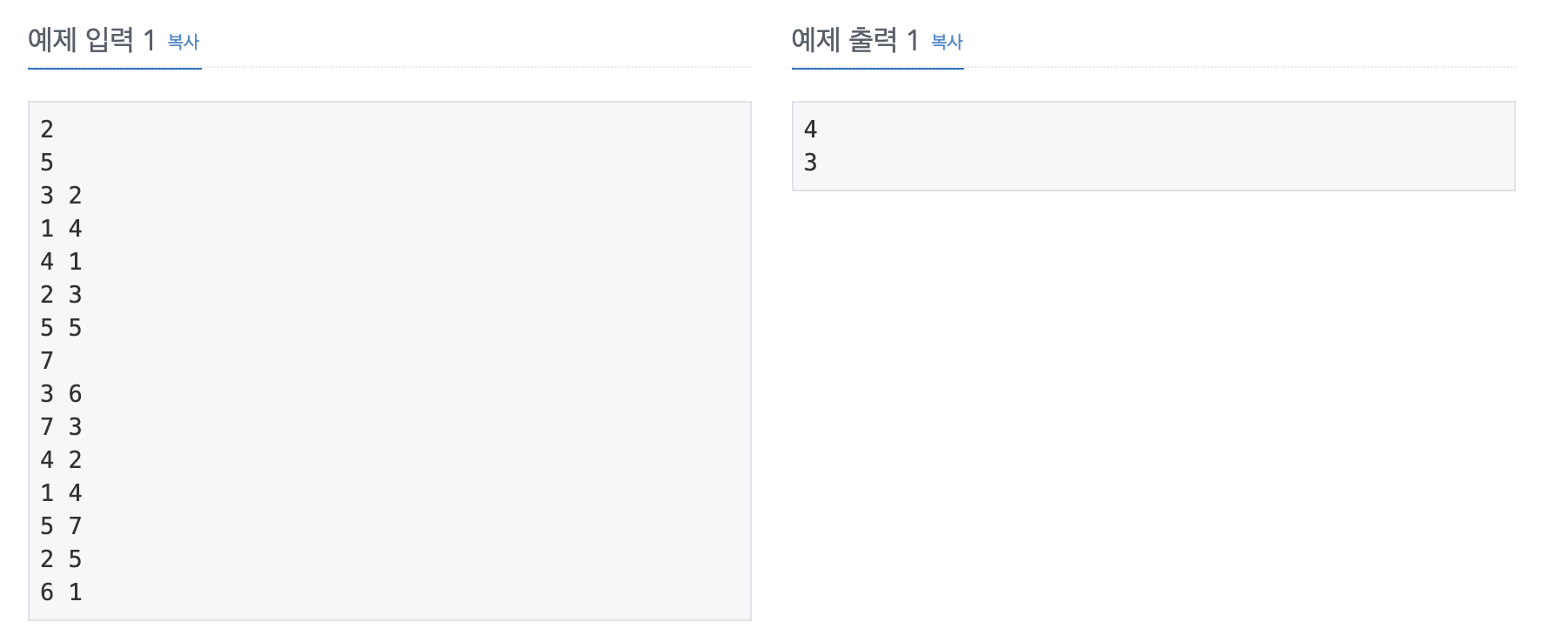첫째 줄에는 테스트 케이스의 개수 T(1 ≤ T ≤ 20)가 주어진다. 각 테스트 케이스의 첫째 줄에 지원자의 숫자 N(1 ≤ N ≤ 100,000)이 주어진다. 둘째 줄부터 N개 줄에는 각각의 지원자의 서류심사 성��