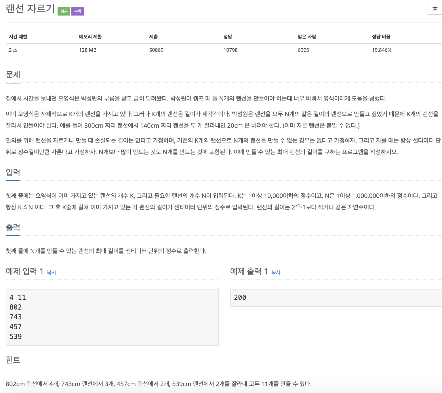 첫째 줄에는 오영식이 이미 가지고 있는 랜선의 개수 K, 그리고 필요한 랜선의 개수 N이 입력된다. K는 1이상 10,000이하의 정수이고, N은 1이상 1,000,000이하의 정수이다. 그리고 항상 K ≦ N 이다. 그