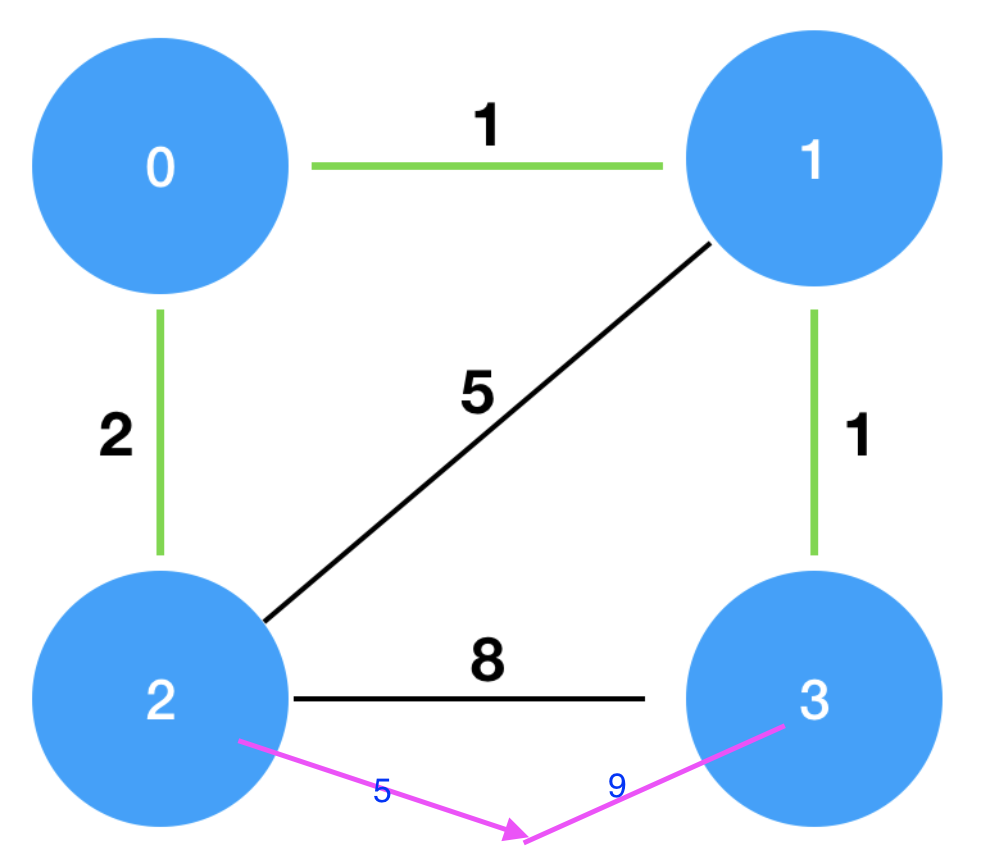 | 4 | [[0,1,1],[0,2,2],[1,2,5],[1,3,1],[2,3,8]] | 4 |