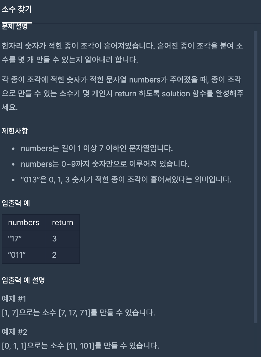 한자리 숫자가 적힌 종이 조각이 흩어져있습니다. 흩어진 종이 조각을 붙여 소수를 몇 개 만들 수 있는지 알아내려 합니다. 각 종이 조각에 적힌 숫자가 적힌 문자열 numbers가 주어졌을 때, 종이