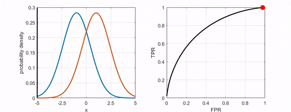 Threshold를 우측에 가깝게 잡으면 : TPR, FPR 모두 낮은 상황 즉, 모든 값이 negative 분류된 상황이다.