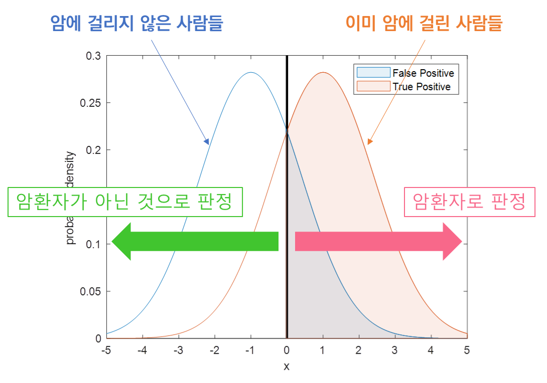 검은색 선 좌측은 암환자가 아닌 것으로 판정 (negative)