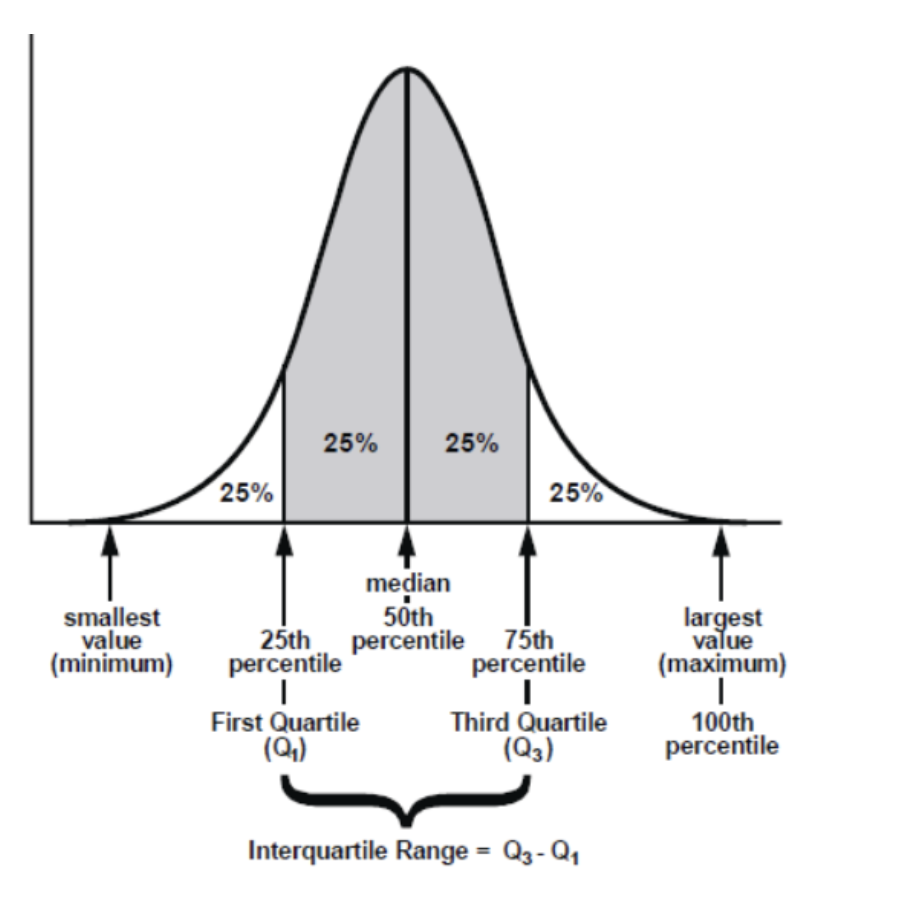 4-Quantile 이라고 생각하면 샘플 데이터를 4개의 동등한 구간으로 잘라내기 위한 구분자는 3개가 된다. Q1, Q2, Q3 와 같이 표현한다.