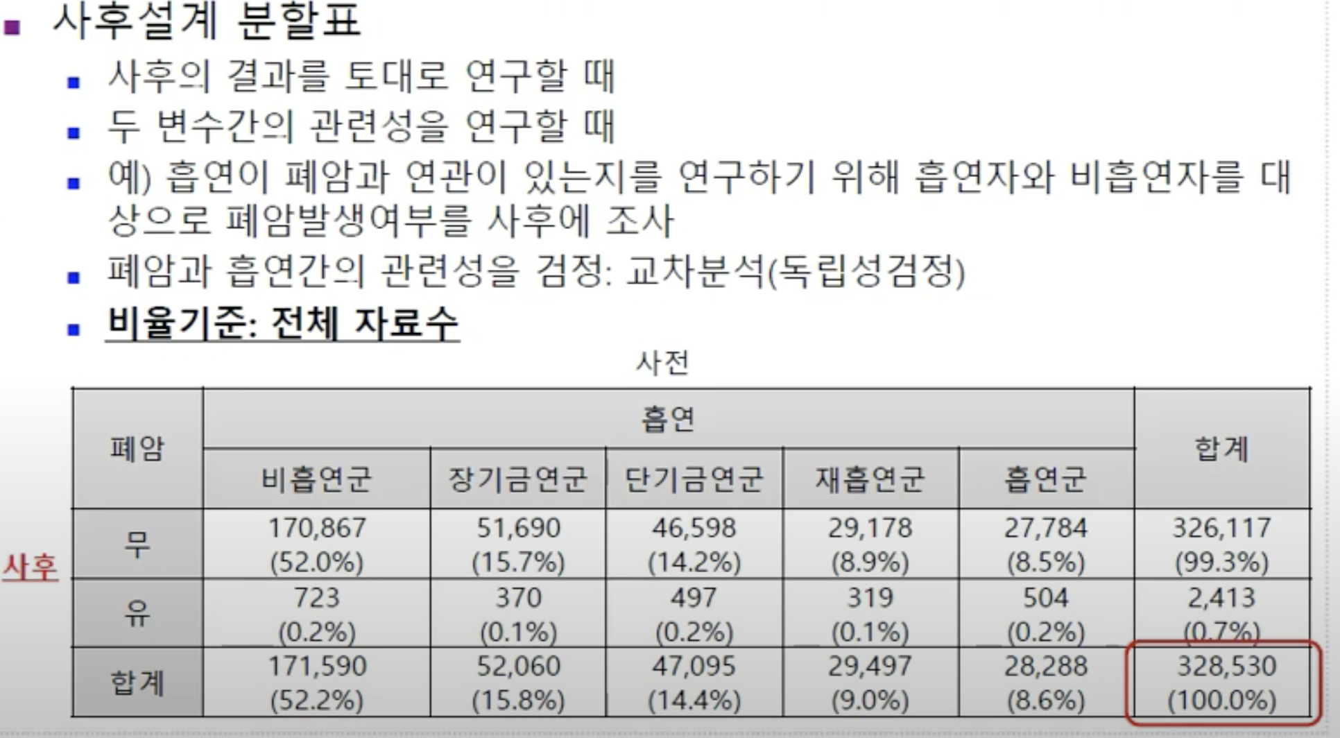 - 폐암 여부는 후에 일어나는 일이기 때문에 사후 / 흡연은 전에 일어나는 일이니 사전