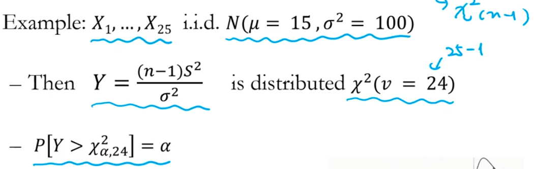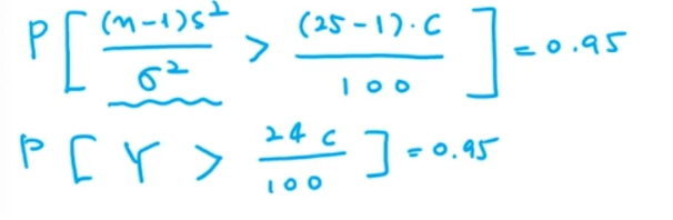 문제 : 모집단 (평균 15, 분산 100) 모집단에서 샘플링 개수 25개 Y (표본의 분포)는 자유도 24의 카이 분포 형태임 -> 자유도 24개 (1개는 정해지게 됨) 표본분산이 C 값보다 클 확률이 0.95 --> C값을 구하라 |