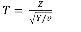표준정규분포(Z)가 분자, 카이제곱 분포(Y)를 자유도(v)로 나눈 값이 분모 --> 이게 T분포의 정의