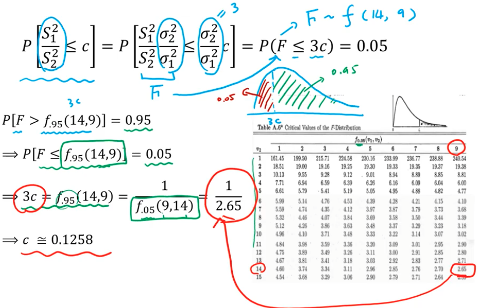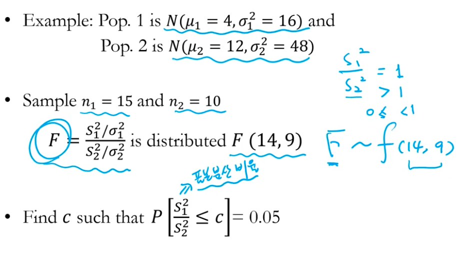 * 이 F분포에서 표본분산비율이 c값보다 적을 확률이 0.05 --> 여기서 c를 찾아라