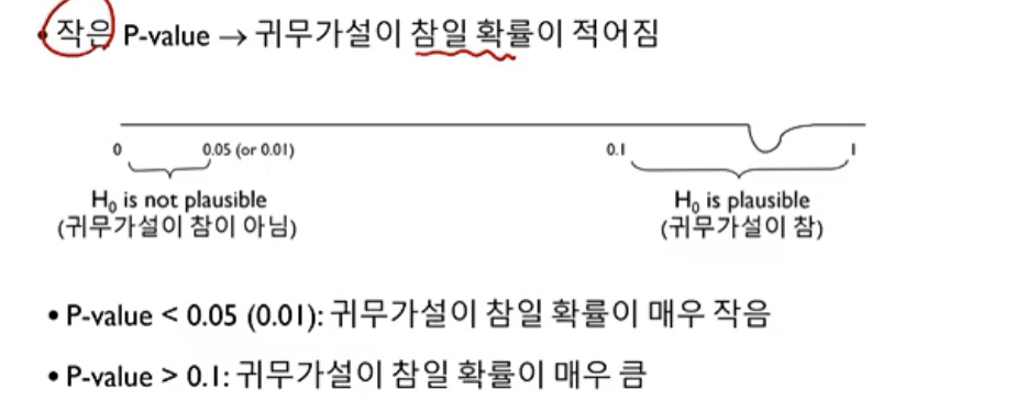 --> Pvalue를 통해 신뢰구간안에 들어가는지 (진위여부 맞는지 아닌지) 확인