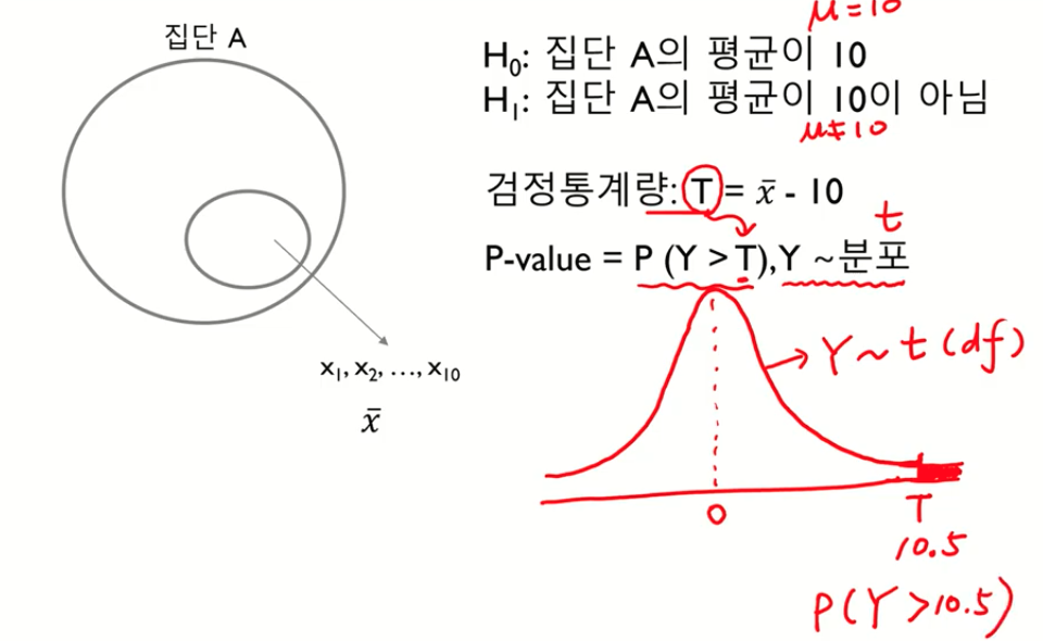 T값보다 클 확률 -> 빨간 면적 ==> P(Y > 10.5) --> 0에 가까운 값