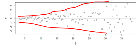 * yhat이 커짐에 따라 e 값의 폭이 커짐