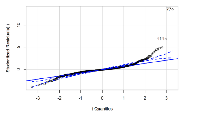 - 잔차들이 정규성을 따른다면 Q-Q Plot상의 점들이 45도 각도의 직선에 밀접