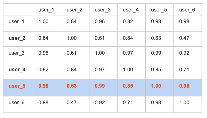 이렇게 각 유저간 cosine similarity matrix 생성 !