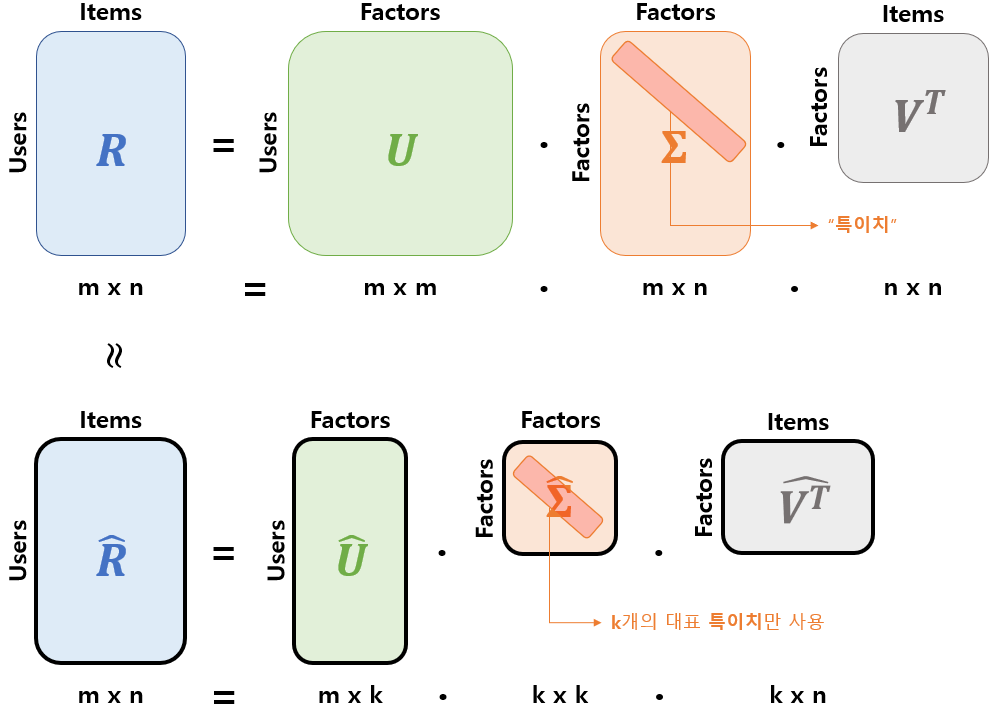 U^ : U에서 k개의 대표 특이치에 대응하는 k개의 성분만 남긴 m x k 크기의 행렬 Σ^ : 대푯값으로 쓰일 k개의 특이치 성분만을 남긴 k x k 크기의 행렬 VT^ : V에서 k개의 대표 특이치에 대응하는 k개의 성분만 남긴 k x n 크기의 행렬 |