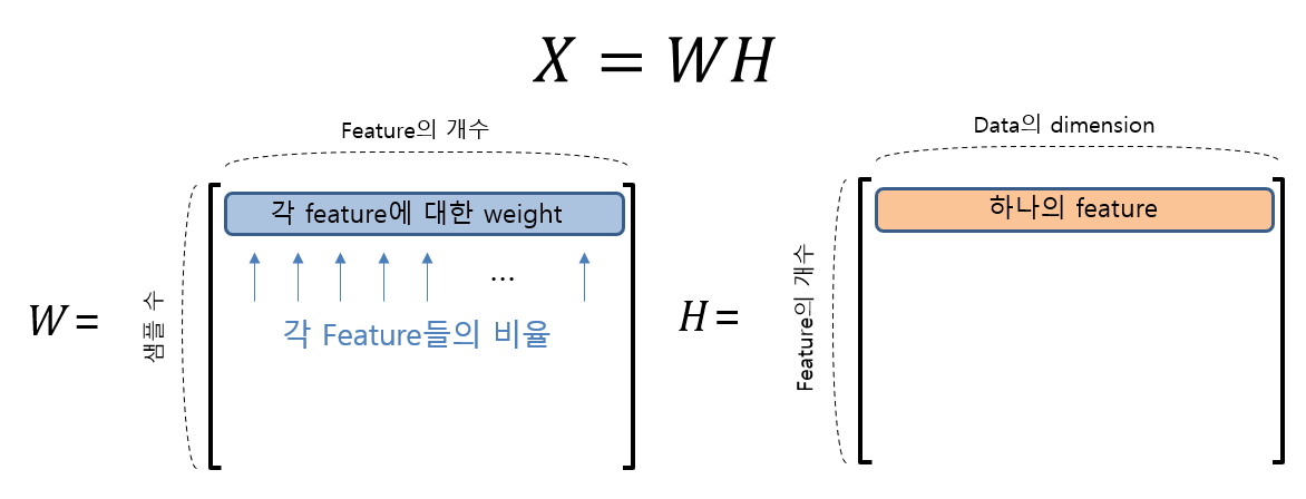 음수를 포함하지 않는 행렬 X 를 --> 음수 포함하지 않는 행렬 W, X로 분해하는 방식
