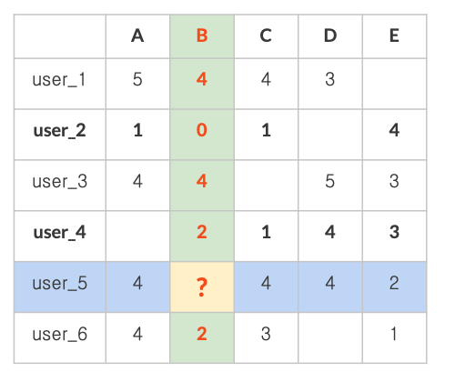 user5 와 user 1의 similarity (=0.98) * user 1의 아이템 B에 대한 평점 (=4)