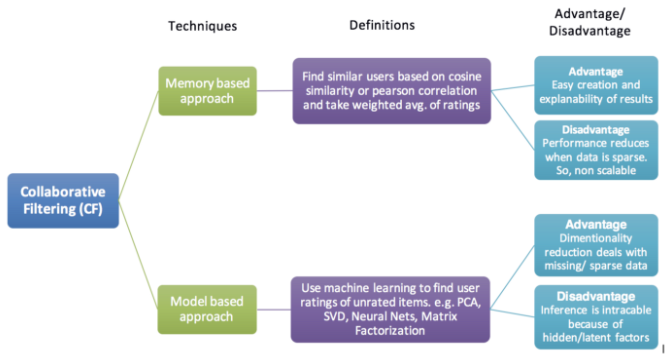 • Memory Based Approach : User-based Filtering, Item-based Filtering