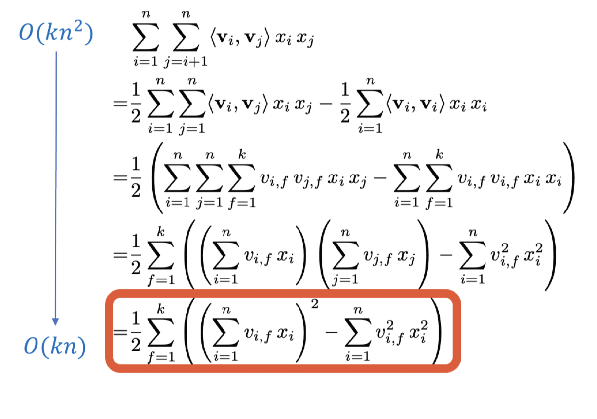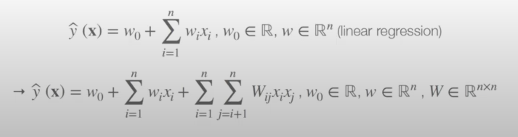 위 식에서 첫 째 항은 global bias, 두 번째 항은 선형 회귀, 세번 째 항이 각 feature 간의 관계를 고려한 부분이다.