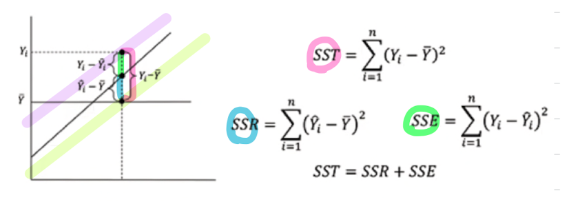분자인 SSR가 0, 즉 예측값이 평균값과 같다는 것.. 예측을 그냥 평균으로 때려맞춤, 예측 개판ㅠㅠ