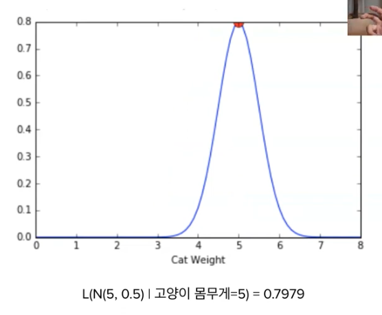 우측의 그래프 : L(N(5,0.5) | 고양이 몸무게 = 5) = 0.7979