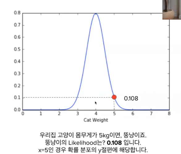좌측의 그래프 : L(N(4,0.5) | 고양이 몸무게 = 5) = 0.108