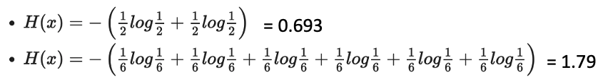 위의 식은 동전 던지기 (앞뒤)고, 아래는 주사위 던지기(1,2,3,4,5,6)의 entropy를 각각 계산한 것이다.