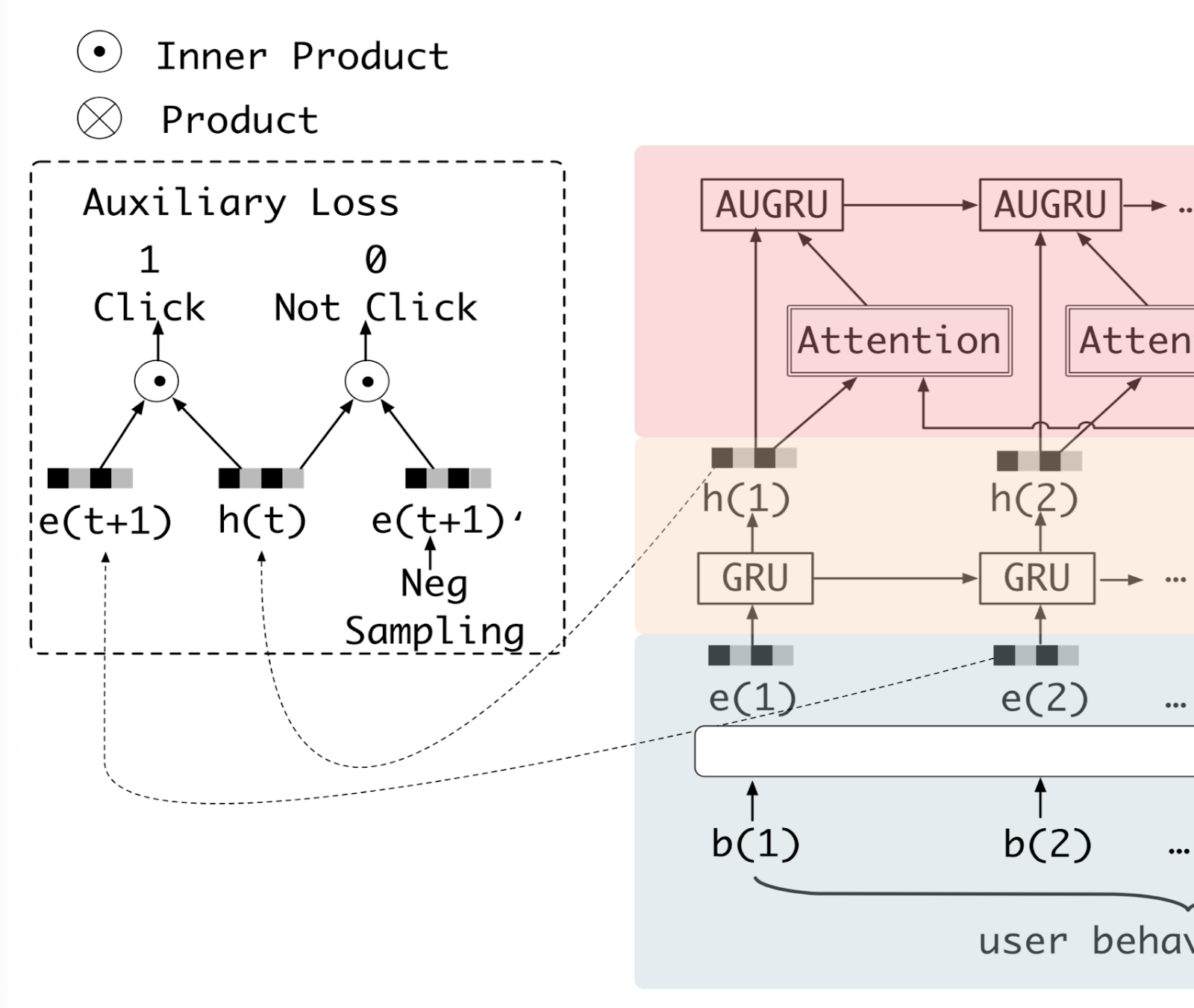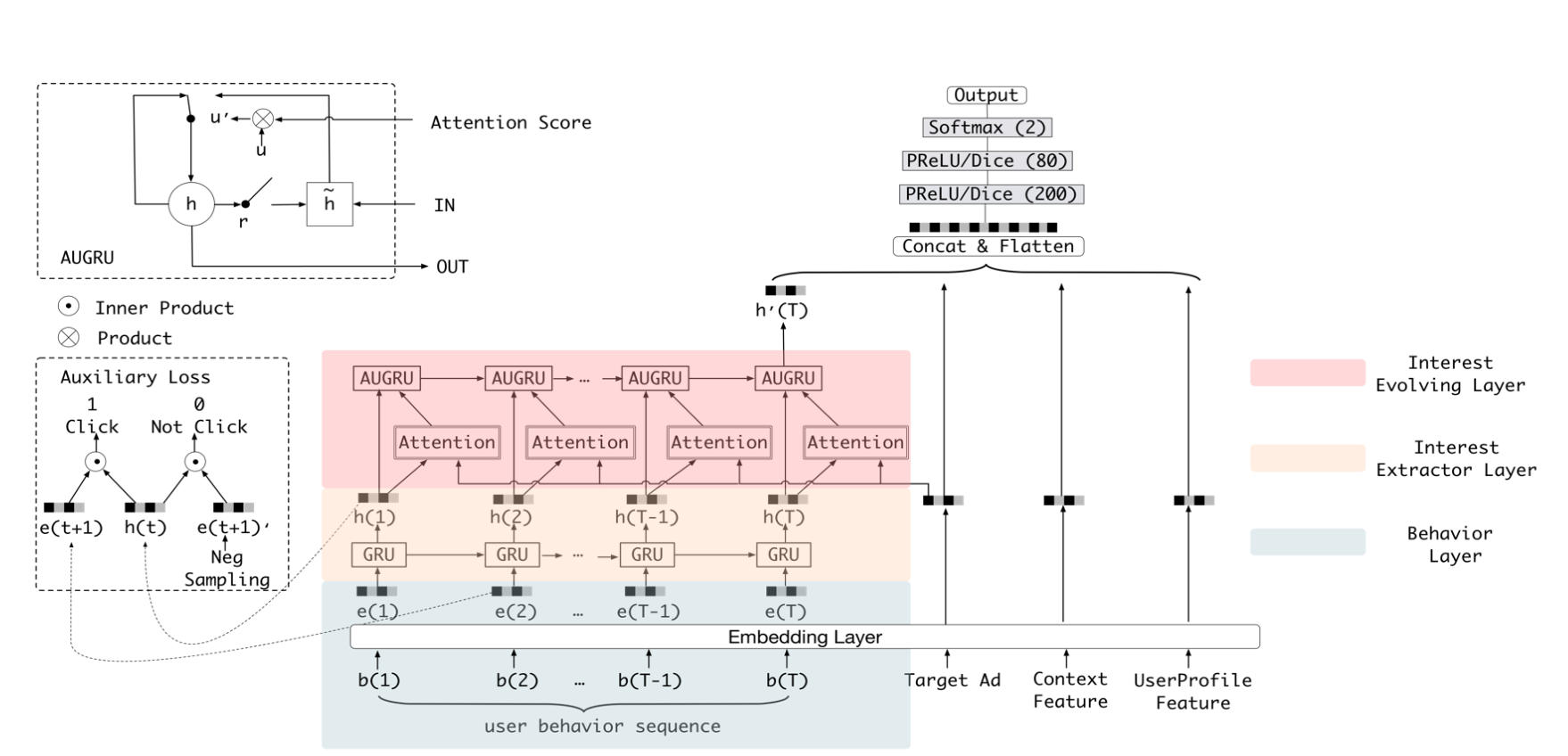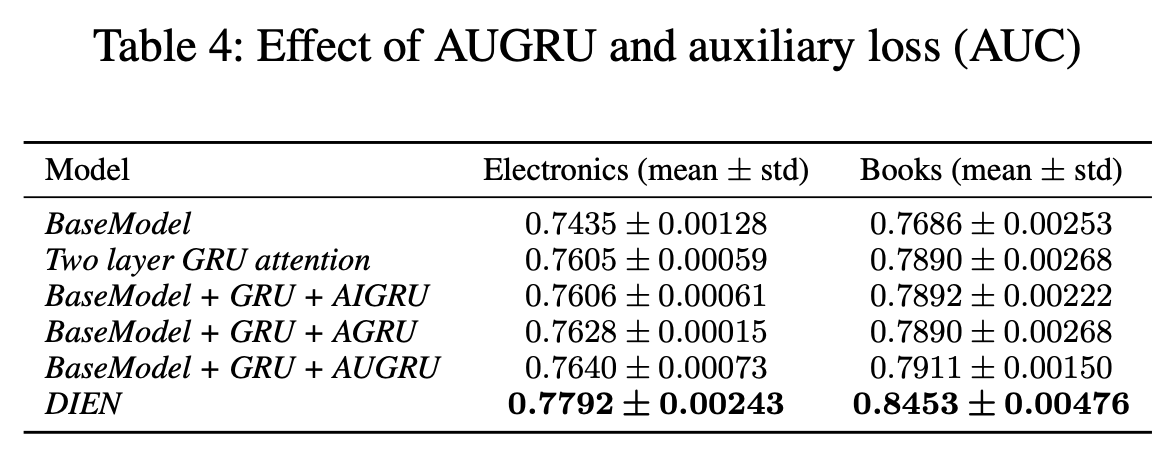 ==> 주목해야하는 technique은 auxiliary loss 와 AUGRU (gru + attention)