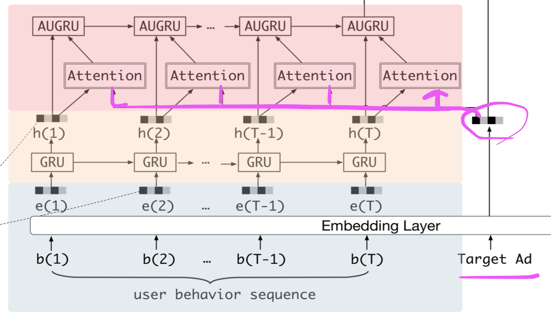 - 구체적인 방법으로 gru의 update gate에 attention 을 적용하는 AUGRU 알고리즘을 활용해서 타겟아이템과 더 연관성 높은 유저의 흥미를 파악하고, 유저의 변화하는 흥미를 파악한다.
