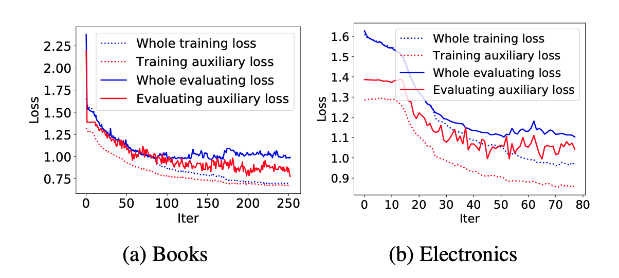 - GRU 시퀀스 전체에 training loss를 먹이는 것보다, hidden state 때마다 loss를 적용하는 auxiliary loss 방식이 학습 과정에서 loss 를 낮추는데 더 도움이 되는 걸 알 수 있음