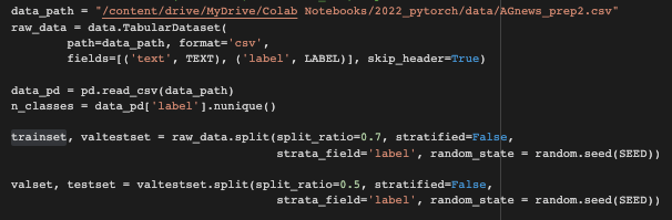 확인해보면 모두 <torchtext.legacy.data.dataset.Dataset at ~~~~ > 객체로 되어있음