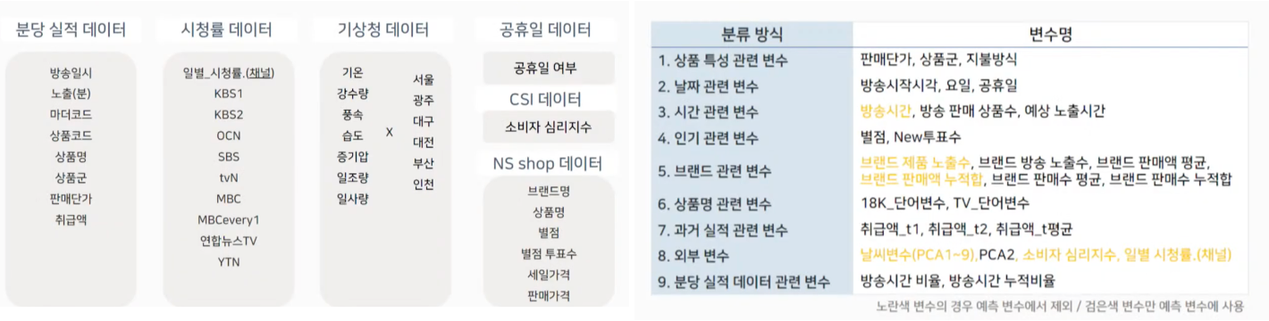 - NS 홈쇼핑에서 제공한 분당 상품별 실적 데이터에 외부 데이터 추가 및 재가공