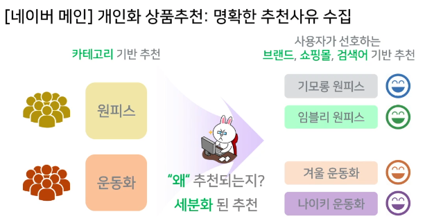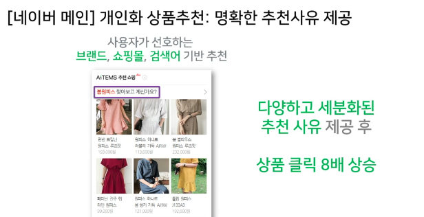 - 추천 사유 (이전 검색 내역, 이전 탐색 페이지 등등)를 파악하는 모듈을 별도로 함께 개발 (어떤 모델인지는 공개하지 않음)