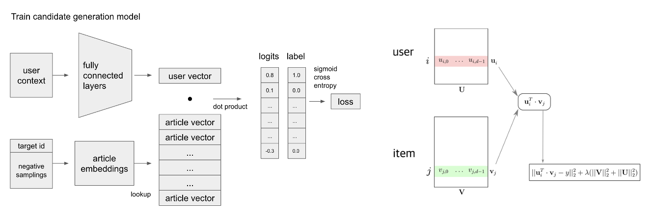 - Matrix Factorization 개념을 이용해 User, item matrix 분할 후 사용자 벡터, 상품 게시글 벡터 내적