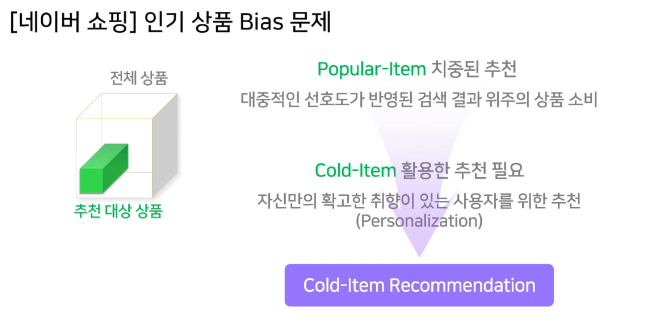 - 비인기 상품은 추천이 되지 않는 문제가 발생 "인기 상품 bias", "cold item problem"
