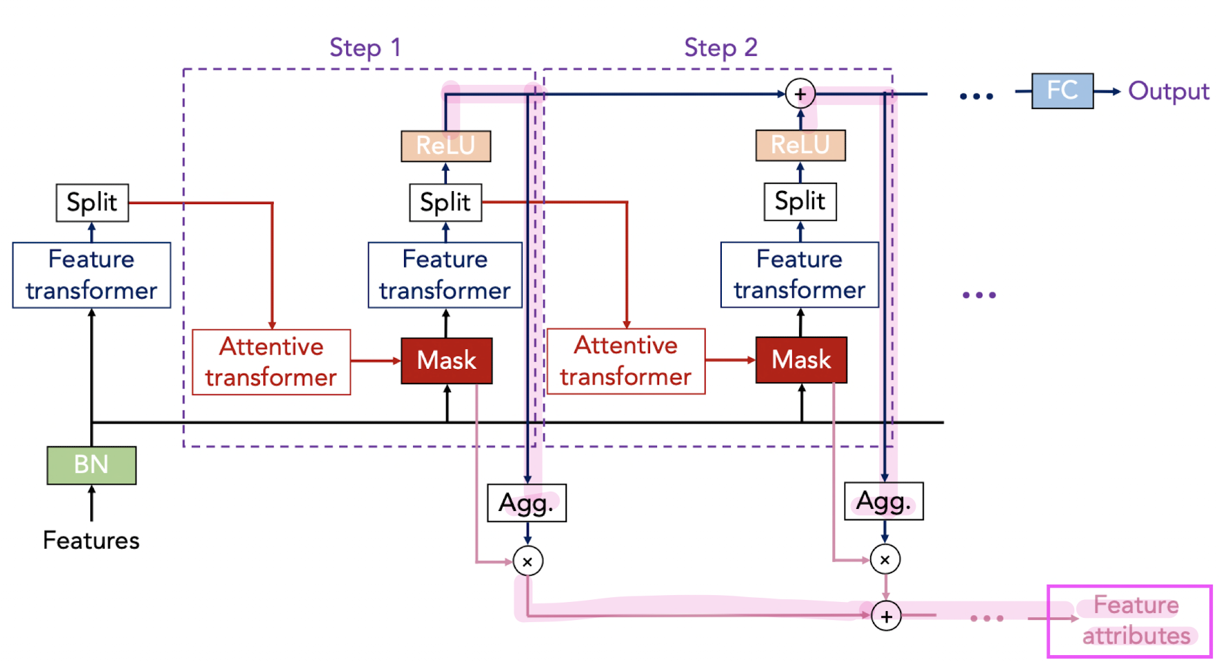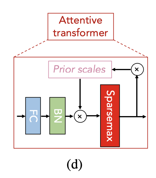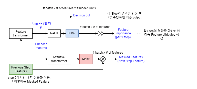 좀 더 자세히 기술하자면, Feature transformer 블록에서 임베딩(embedding)을 수행하고, Attentive transformer 블록에서 trainable Mask를 생성합니다. 이 Mask는 3가지 용도로 활용됩니다. 1) Feature Importance를 계산,