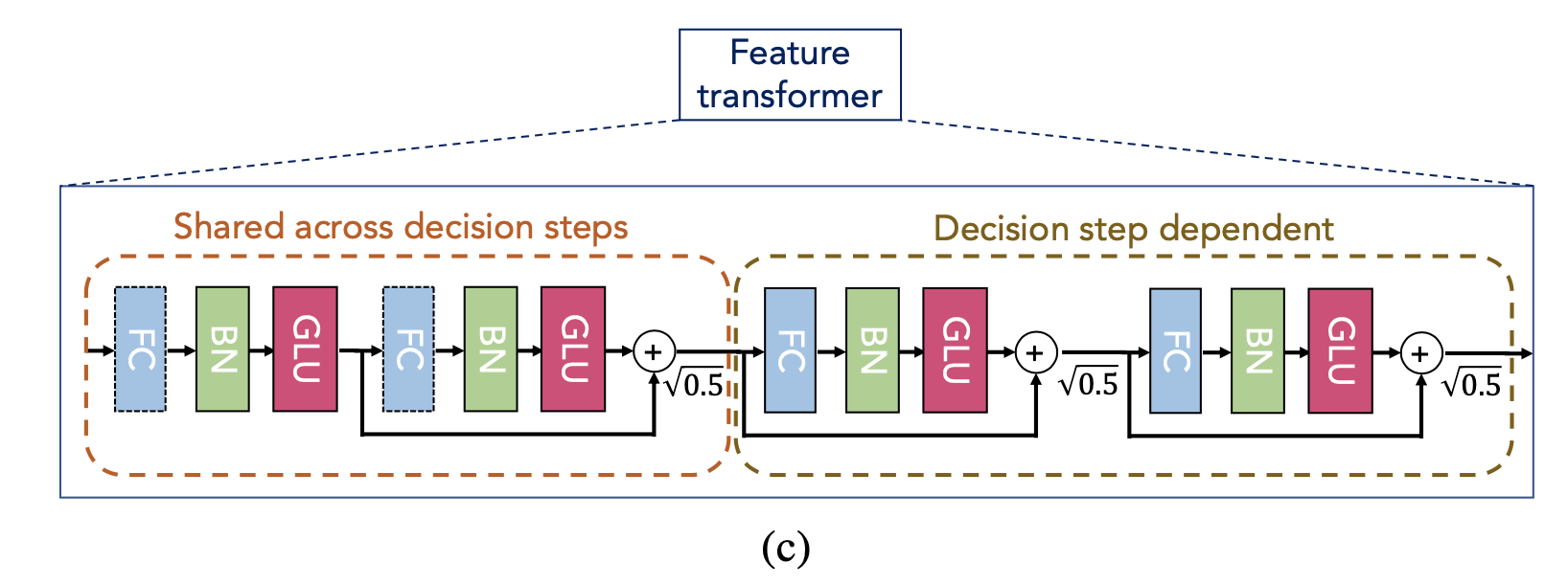 ⓵ feature transformer : batch norm을 거친 input data를 임베딩 (FC + BN + GLU) → $\mathrm{f_{0}}$