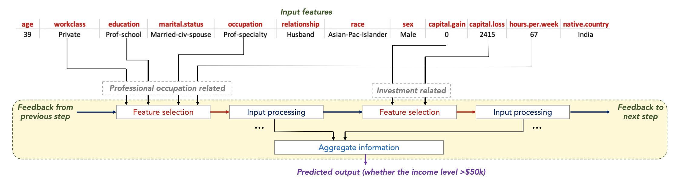 - 이 과정 반복한 뒤 각 step 에서 나온 information을 취합해 학습 모델에 input