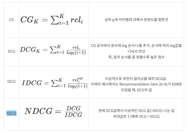 현재 DCG값에서 이상적인 DCG 값(=IDCG) 나눈 값, 최대값은 1 (예측 DCG = IDCG)