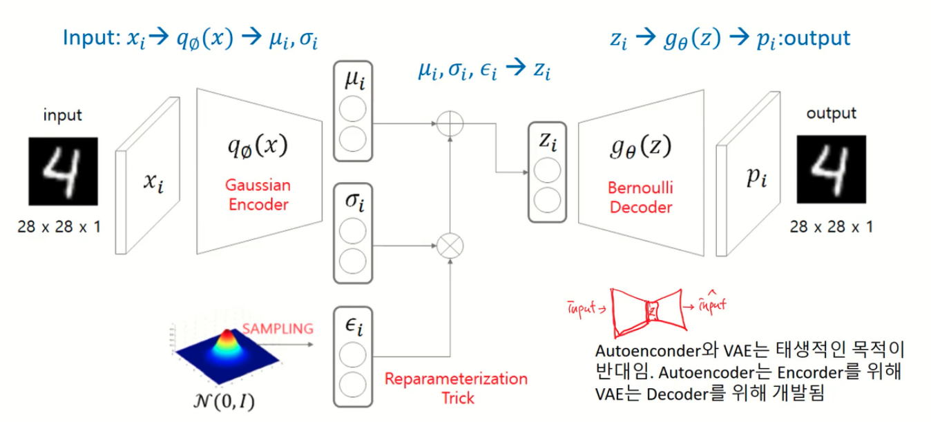 기존 VAE 모델에서는 encoder에서 gaussian distribution을 가정하고, decoder에서 bernouii distribution을 가정하지만,
