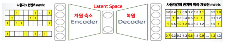 상품, 콘텐츠의 메타정보가 포함된 matrix를 dense 한 latent space 로 압축 (Embedding)