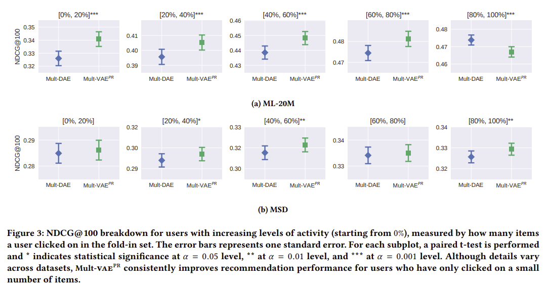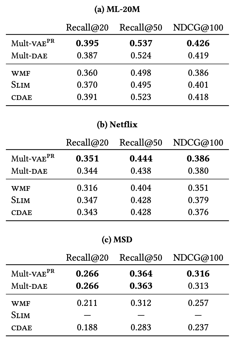 - Mult-VAE은 최근에 제안된 neural-network-based CF 모델들보다 SOTA성능을 달성