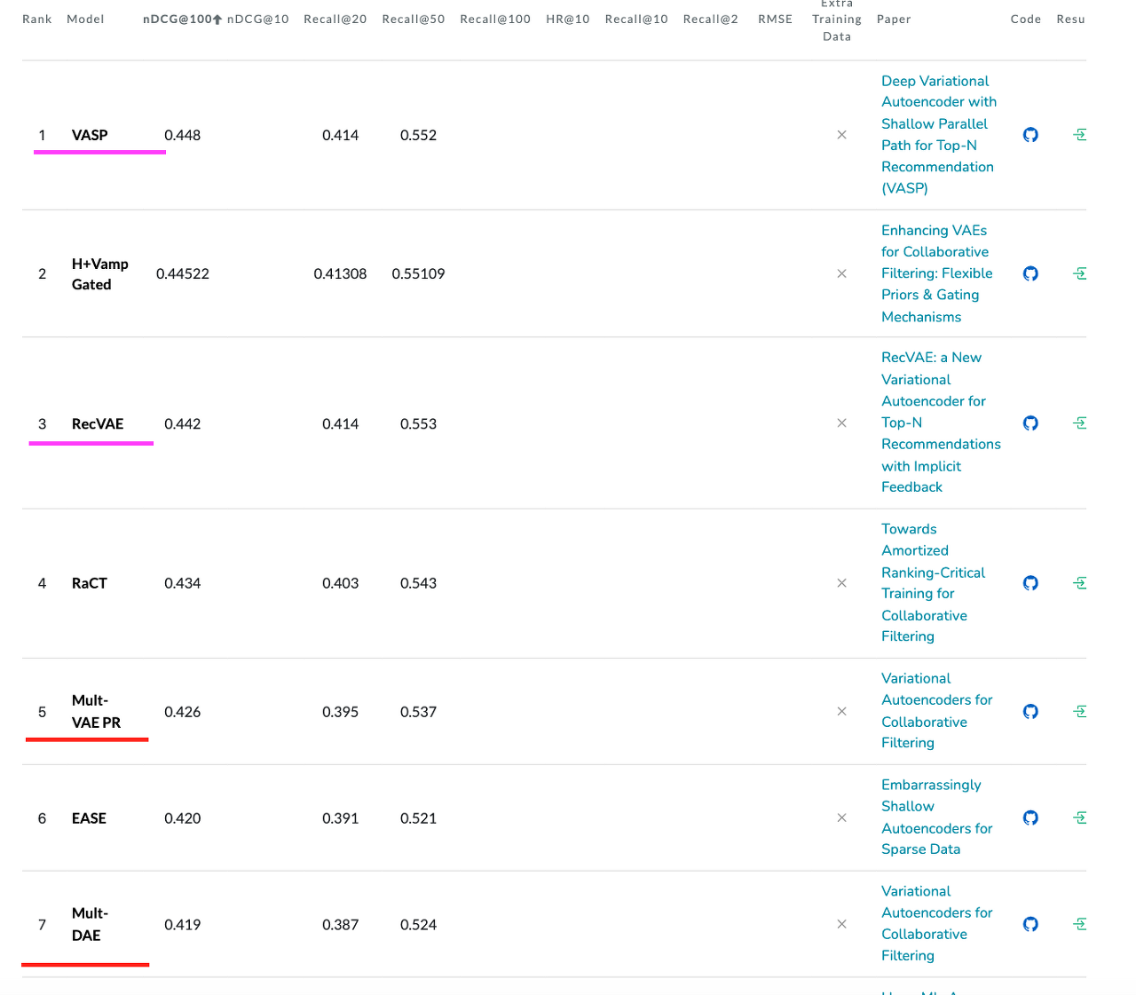 paper with code에서 MovieLens 20M 데이터 기준으로 봤을때 많은 AE기반 모델들이 순위에 랭크된 걸 확인할 수 있다.