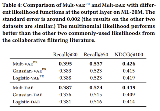 - DAE와 VAE에서 multinomial likelihood를 사용하는 것이 다른 Gaussian이나 logistic likelihoods보다 더 나음