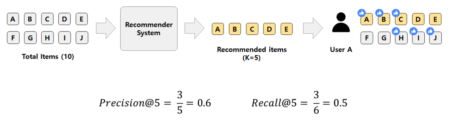 Recall@K는 사용자가 관심있는 모든 아이템 중에서 내가 추천한 아이템 K개가 얼마나 포함되는지 비율
