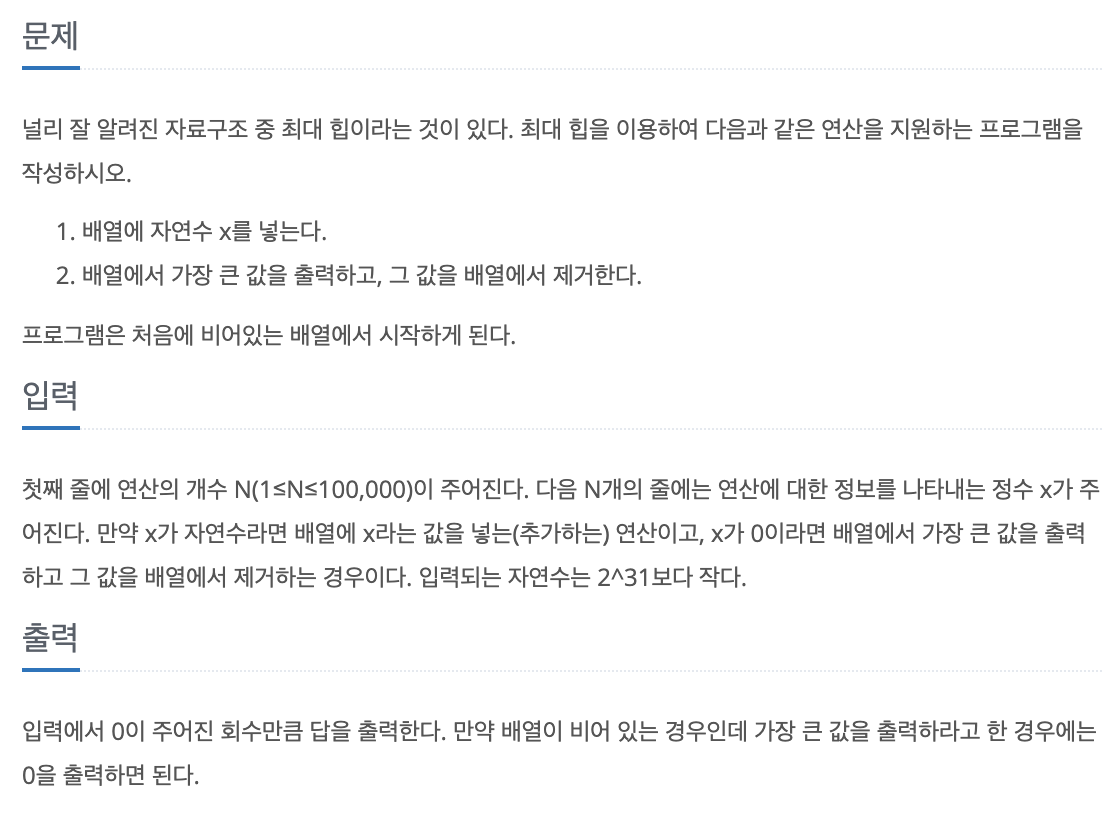 앞에서 풀었던 최소힙은 python 의 heapq 모듈을 활용해서 힙 자료구조 형태를 만들어 풀었다.
