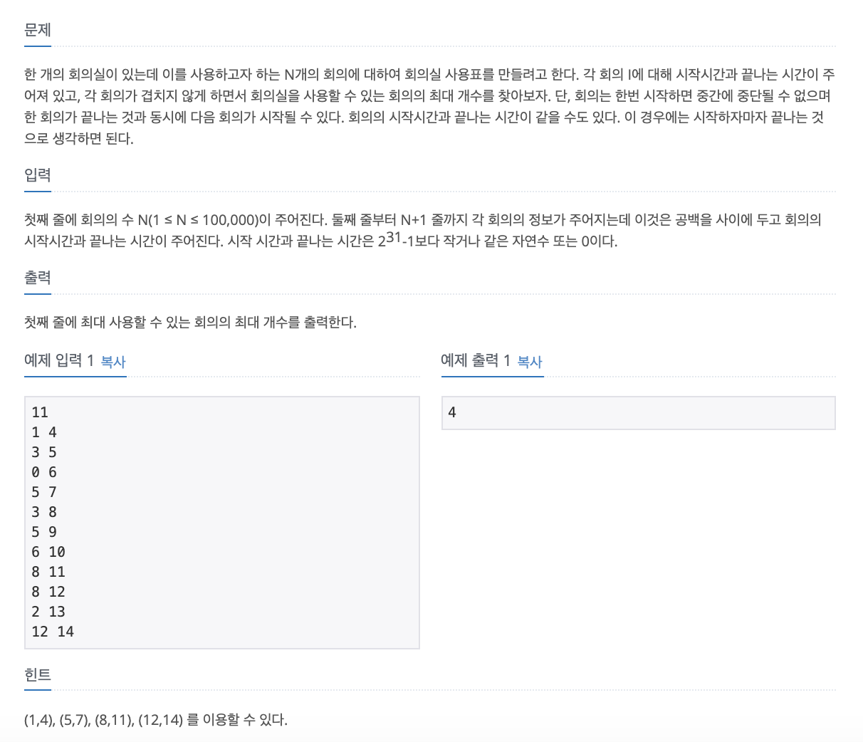 즉, 여기서 중요한 거는 최대한 많은 회의실을 배정하게끔 알고리즘을 짜는건데